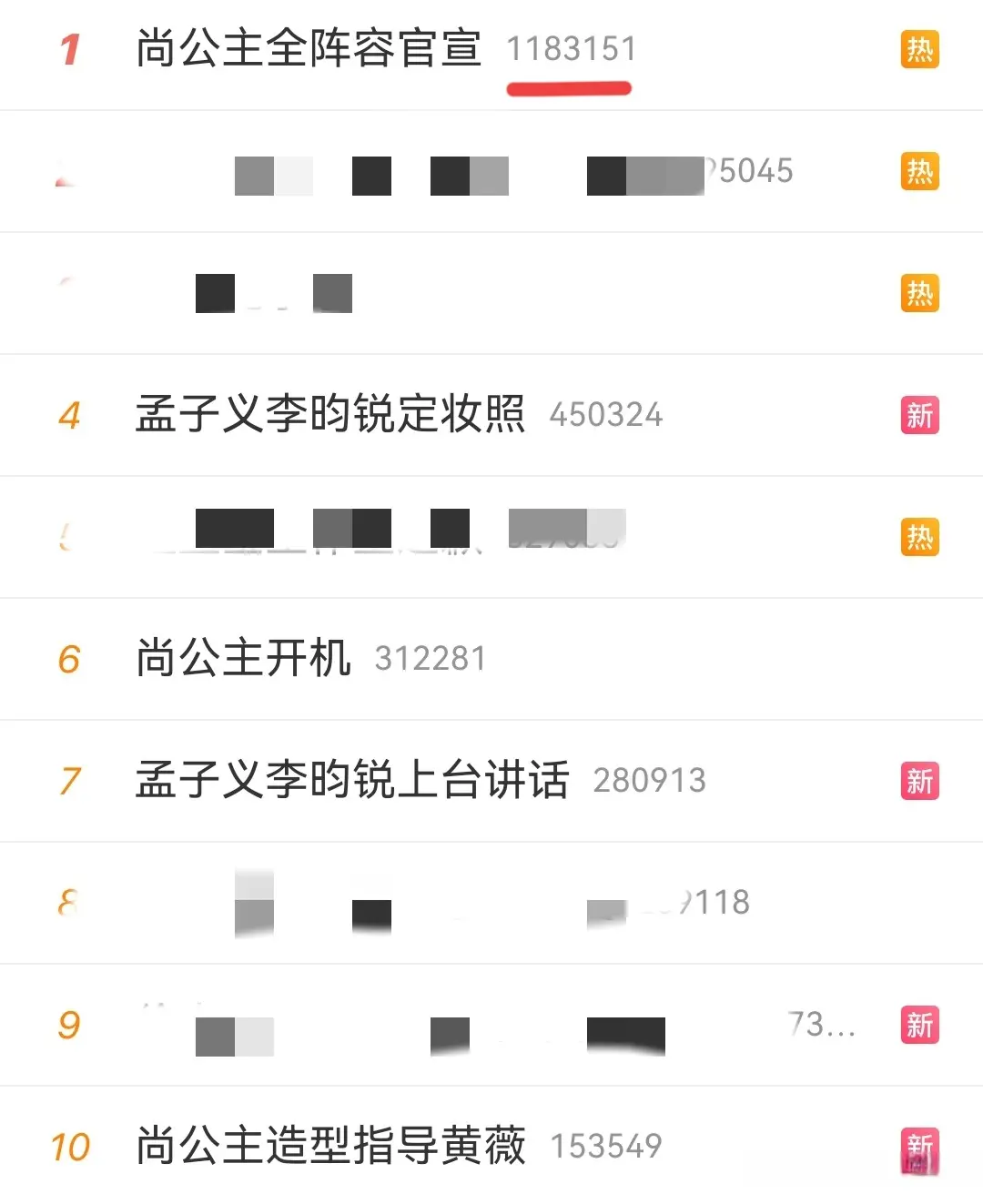 《尚公主》还是像网友们所预料的那样鑫策略,开机仪式开启,直接冲上热榜第一就没下来过,断崖式领先,热榜前十直接占了5个,只能说还得是昀牵梦绕cp组合在娱乐圈的影响力大。