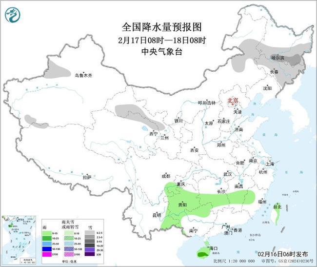 图3 全国降水量预报图(2月17日08时-18日08时)