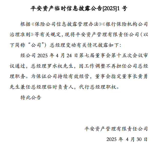 4月30日,平安资产管理有限责任公司发布公告称迎客松配资,经公司2025年4月24日第七届董事会第十五次会议审议通过,总经理罗水权,因工作调整不再担任公司总经理职务。为保证公司持续有效经营,董事会指定董事长黄勇兼任总经理临时负责人,代行总经理职权。
