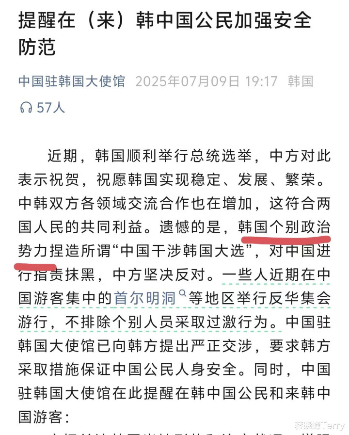 韩国选前选后的反华事件终于惊动李在明。选举期间他不便发声也能理解,免得被贴上China lee的标签;选后同样的群体继续煽动反华,在闹市区举着韩国和美国国旗,用A4纸打印China out(中国滚出去)等字样,高喊口号,招摇过市。
